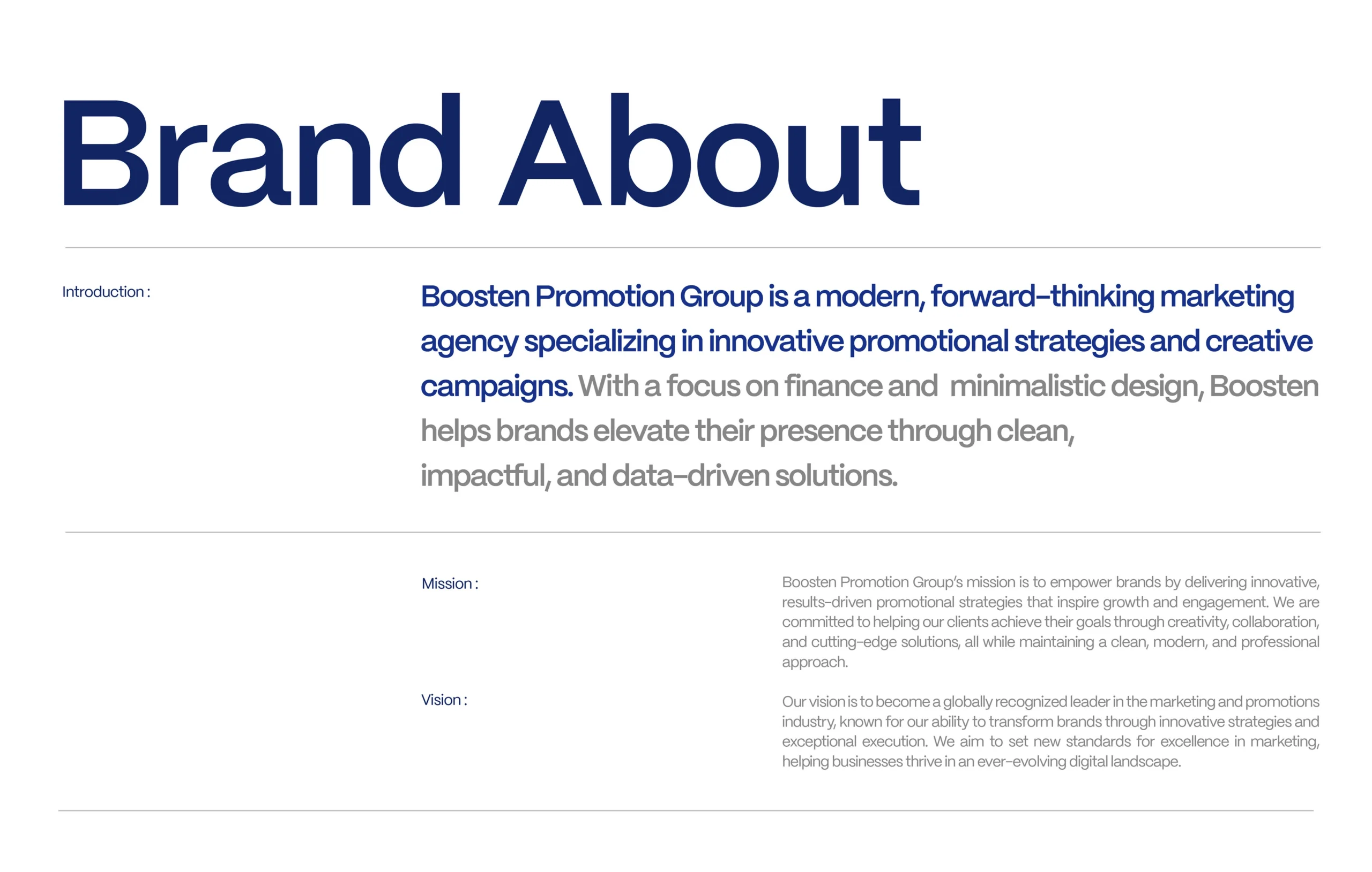 AUZ Solutions developed a complete brand identity for Boosten Promotion Group, a modern marketing agency focused on finance and minimalistic design. The objective was to create a visual system that reflects innovation, professionalism, and strategic clarity — perfectly aligning with Boosten’s mission to deliver data-driven promotional strategies.
