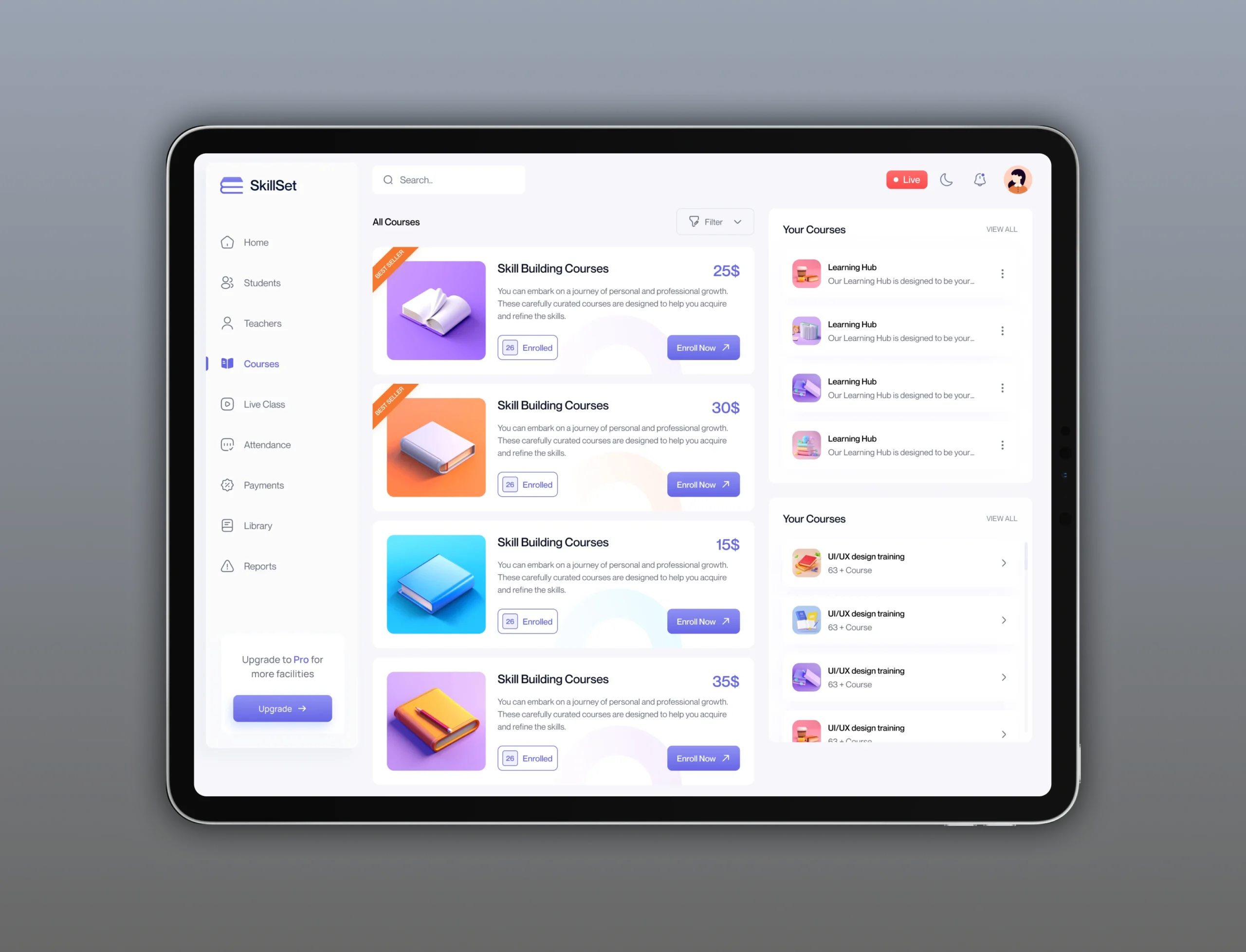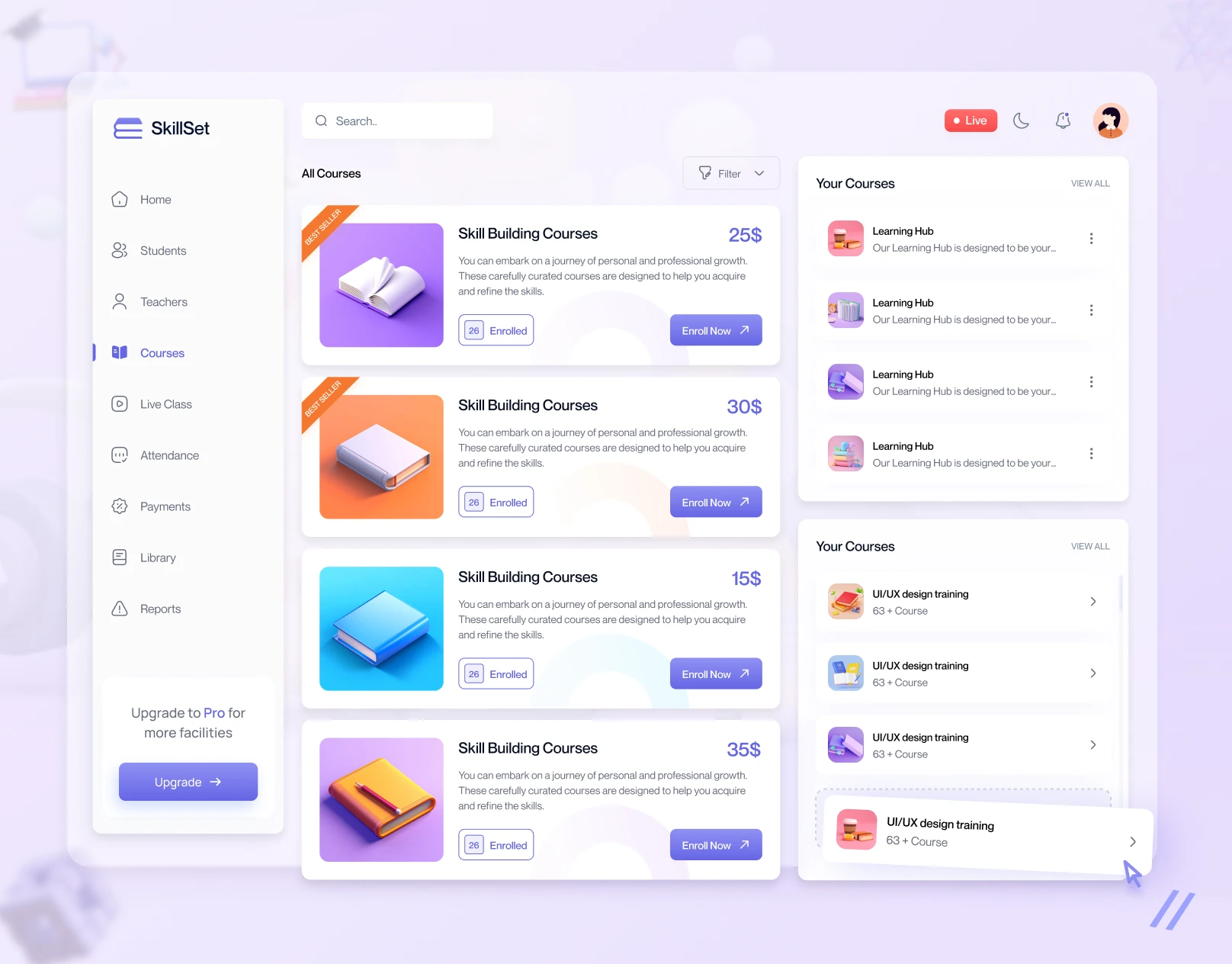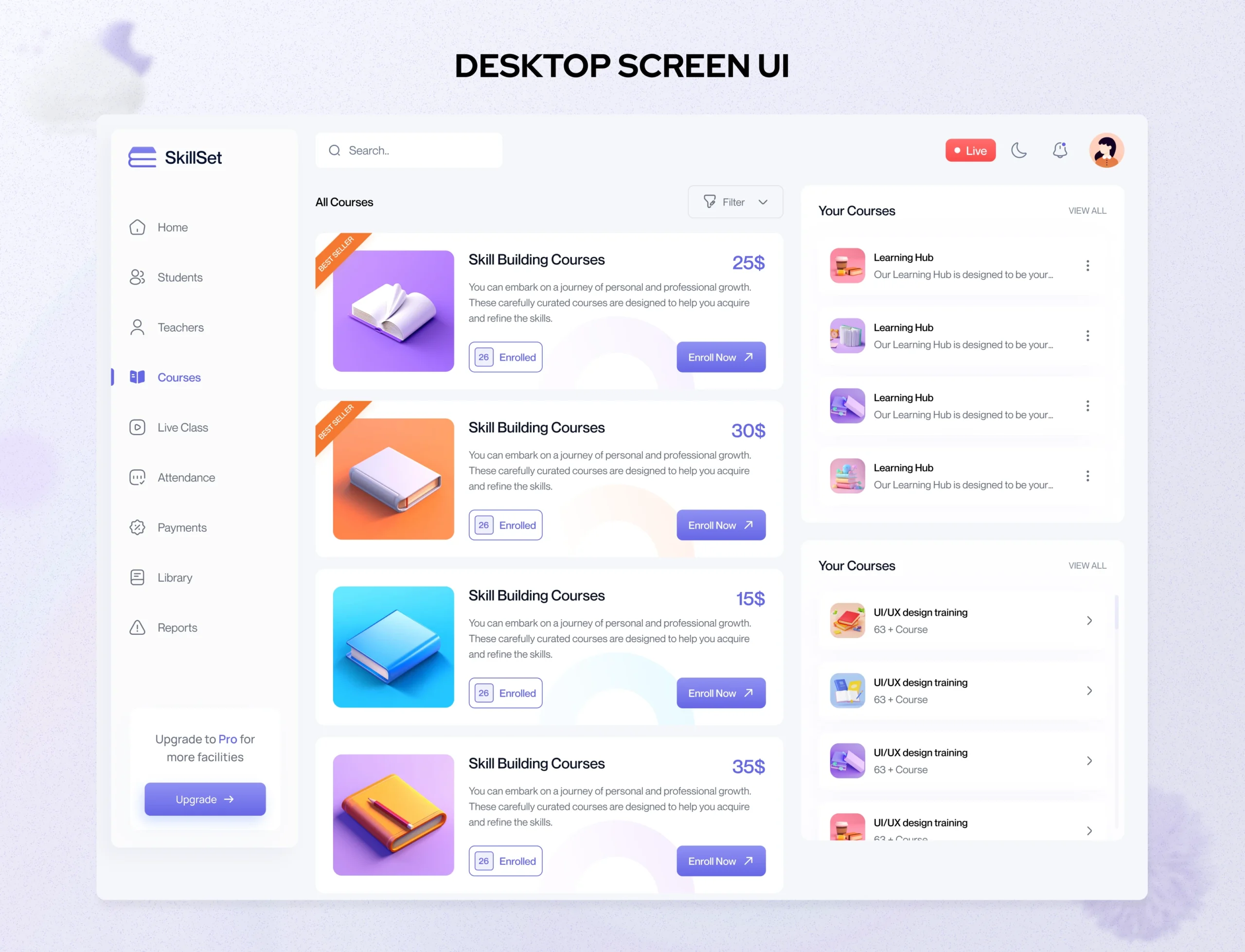 A modern SaaS web application built for online courses, featuring user dashboards, course pages, and scalable UI for both learners and admins. (Based on concept from Behance: “SaaS Web Application - Online Course Page”) Behance +1